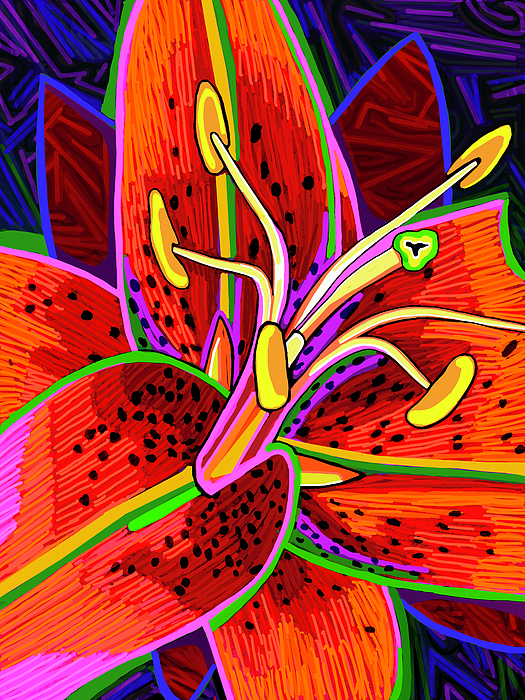 A vibrant close-up of a flower showcases bright orange petals with dark spots and yellow stamens against a contrasting dark background. Bold outlines and vivid colors give the image a dynamic and energetic feel.