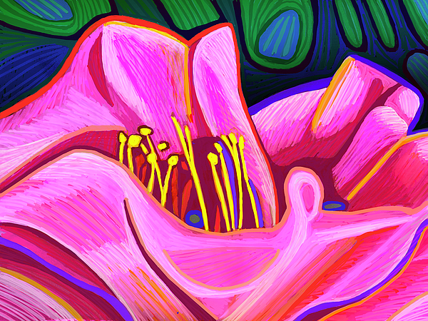 Vibrant pink shapes dominate the foreground, evoking the impression of flower petals, with yellow details suggestive of stamens or pistils at the... more